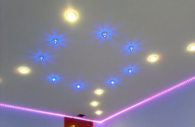 Световое декорирование потолочного пространства выполняется с помощью светодиодной ленты или ламп со специальной насадкой для рассеивания света. Светодиодная лента выполняется в виде гибкой прозрачной пластиковой полоски, на которой располагаются маленькие точечные светильники. Лента имеет толщину примерно 3 мм и ширину 1 см, благодаря таким параметрам появляется возможность маскировки прибора освещения за элементами натяжной потолочной конструкции.