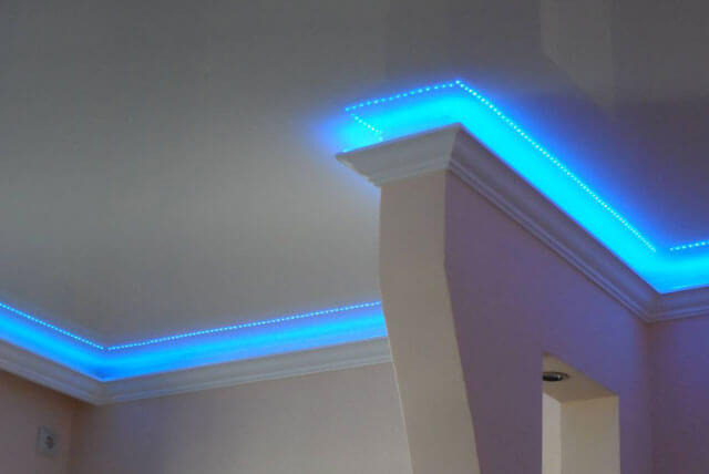 Если спрятать светодиодную ленту в карнизе по периметру потолка, то натянутое полотно будет играть роль плафона. В результате получается ровный матовый свет при замаскированных приборах освещения.