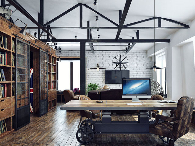 Для декорирования натяжных полотен в кабинете в стиле Лофт часто применяют осветительные приборы в оригинальном каркасе. Для этого, как правило, приходится прибегать за помощью к профессионалам. В целом отделка небольшого кабинета должна быть глянцевой, что придаст комнате дополнительный объем.