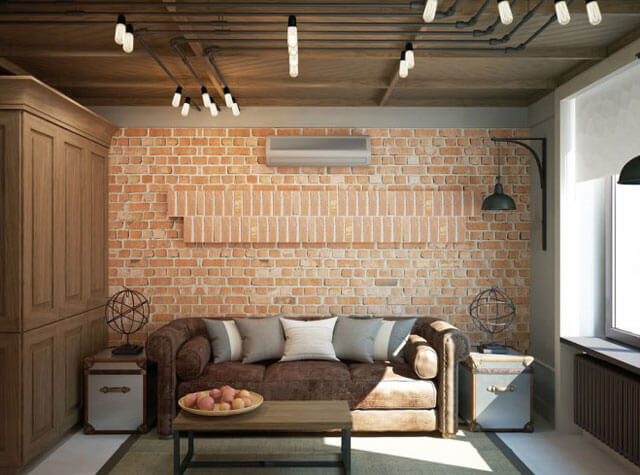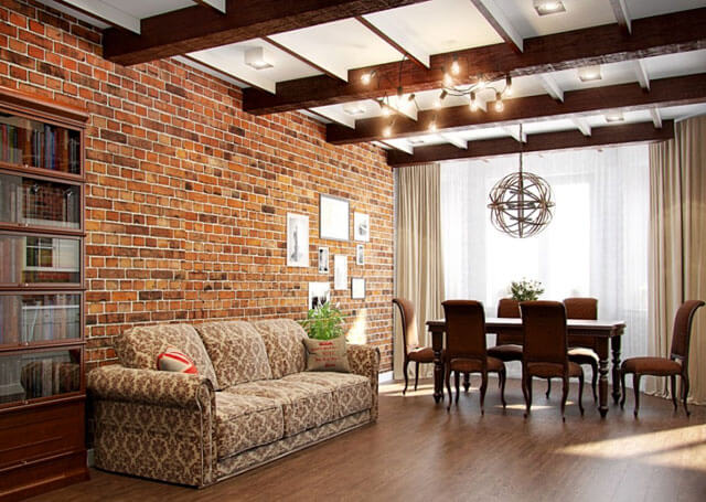 - Многоцветное помещение. Очень эффектный вариант, предусматривающий создание контраста между кирпичными стенами и глянцевой потолочной поверхностью. Для этого необходимо применить 2-3 цветовых акцента: это сделает основной оттенок более выраженным и чистым. При этом важно соблюдать меру, чтобы не смазать первоначальную картину.