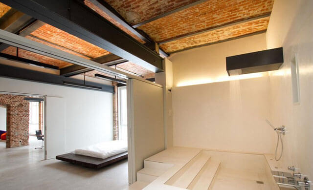 - Просторная квартира студия. Чтобы отделить спальню, можно использовать перегородку из стекла. Для потолков в таком случае выбирается белое полотно с матовым эффектом. Грубый кирпич, скомбинированный с прозрачным стеклом и светлым потолком, создаст стильное и неожиданное впечатление. Перегородка даст возможность закрыть от гостей спальное место.