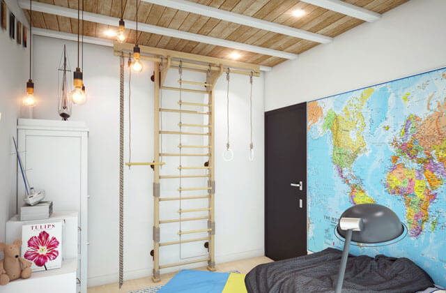 В тех случаях, когда помещение располагается на мансарде, это дает дополнительные козыри. Благодаря рельефным стенам и гладкому натяжному потолку детская будет выглядеть очень достойно.