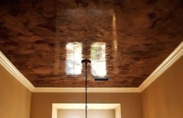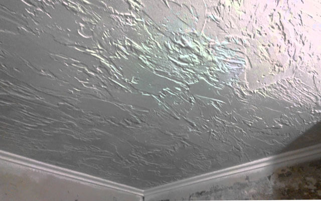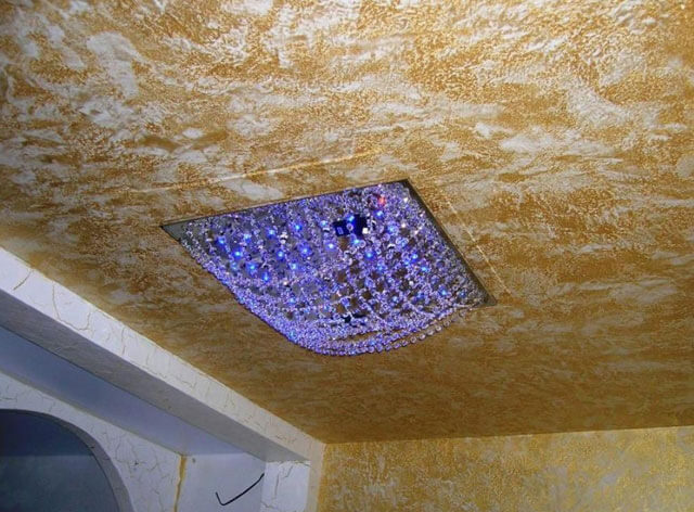 Данный вид декоративных штукатурок будет выглядеть на потолке эффектно благодаря фактуре, образующийся после высыхания состава и тонирования красками.