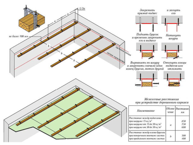 Как и в предыдущем случае, сначала устанавливают направляющие — крепят брус по периметру стен. Затем вдоль линий разметки на потолке прикручивают металлические подвесы для гипсокартона. Рейки располагают рядами параллельно одной из стен, между ними вставляют короткие отрезки. Крепят обрешётку саморезами по дереву.