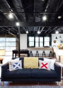 - Для гостиной такое решение и вовсе является оптимальным, поскольку позволяет создать легкую клубную атмосферу. Здесь никто не находится на протяжении всего дня, потому и черный потолок, и яркие кричащие акценты самых неожиданных расцветок покажутся уместными.
