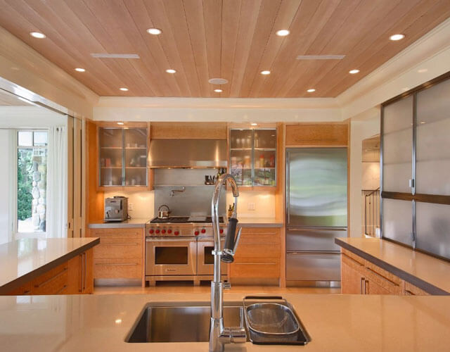 Установка реечных потолков позволяет на долгое время сохранить красоту и практичность кухонного потолка. Именно такой вариант сочетает в себе решение эстетического и практического вопроса.