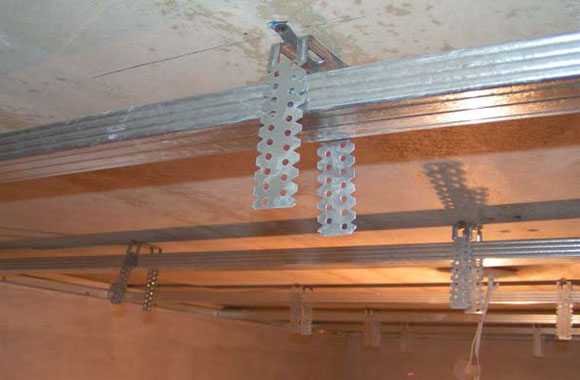 Для многоуровневых потолков или конструкций, расположенных слишком далеко от плит перекрытия, иногда длины стандартного подвеса не хватает. В этом случае используют подвесы в виде стержня с фиксируемым кронштейном. Края стоечного профиля крепят к стартовому. В местах пересечений стоечных профилей для фиксации узла прикрепляют «крабы». На этом сборка каркаса завершена, остается лишь обшить его листами гипсокартона и выполнить финишную отделку.